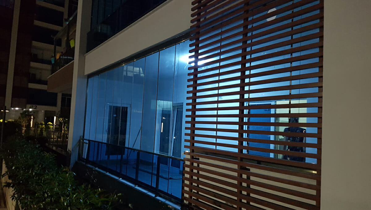 Edirne Keşan Yaylasahilde, Atalay Bey’in üstü kapanarak yapılan cam balkonu. Füme cam ve bronz profil.